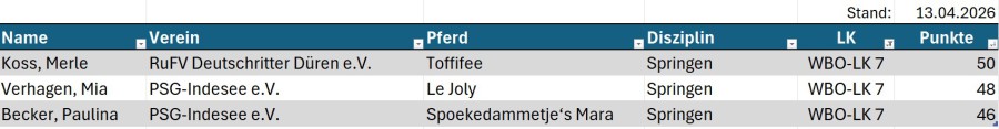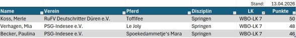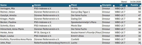 - Dressur: Wertnote (WN) ab 6,0 bzw. 60%